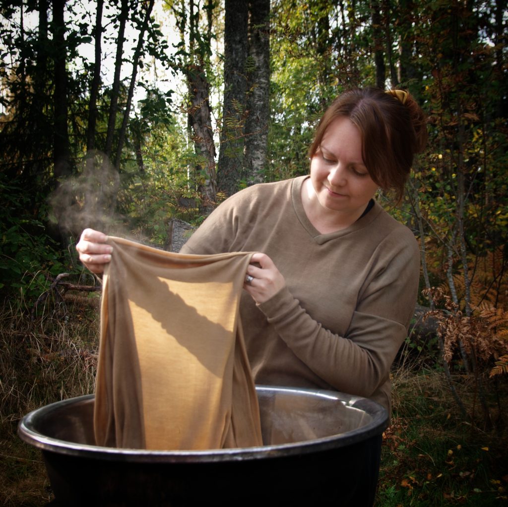 Värit tuotteisiin tulee luonnosta. Kasvivärjään neulosta ja kangasta käsityönä pieniä määriä kerrallaan, joten värilliset tuotteet ovat yksilöllisiä, kun värjäyksen lopputulos on joka kerta erilainen.