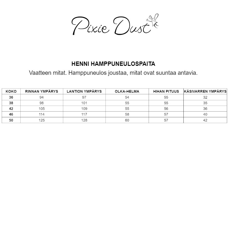 Neulos saattaa kutistua ensimmäisessä pesussa pituudesta n. 5%, tämä on huomioitu mitoissa. Näet suuntaa antavat mitat viimeisestä kuvasta.