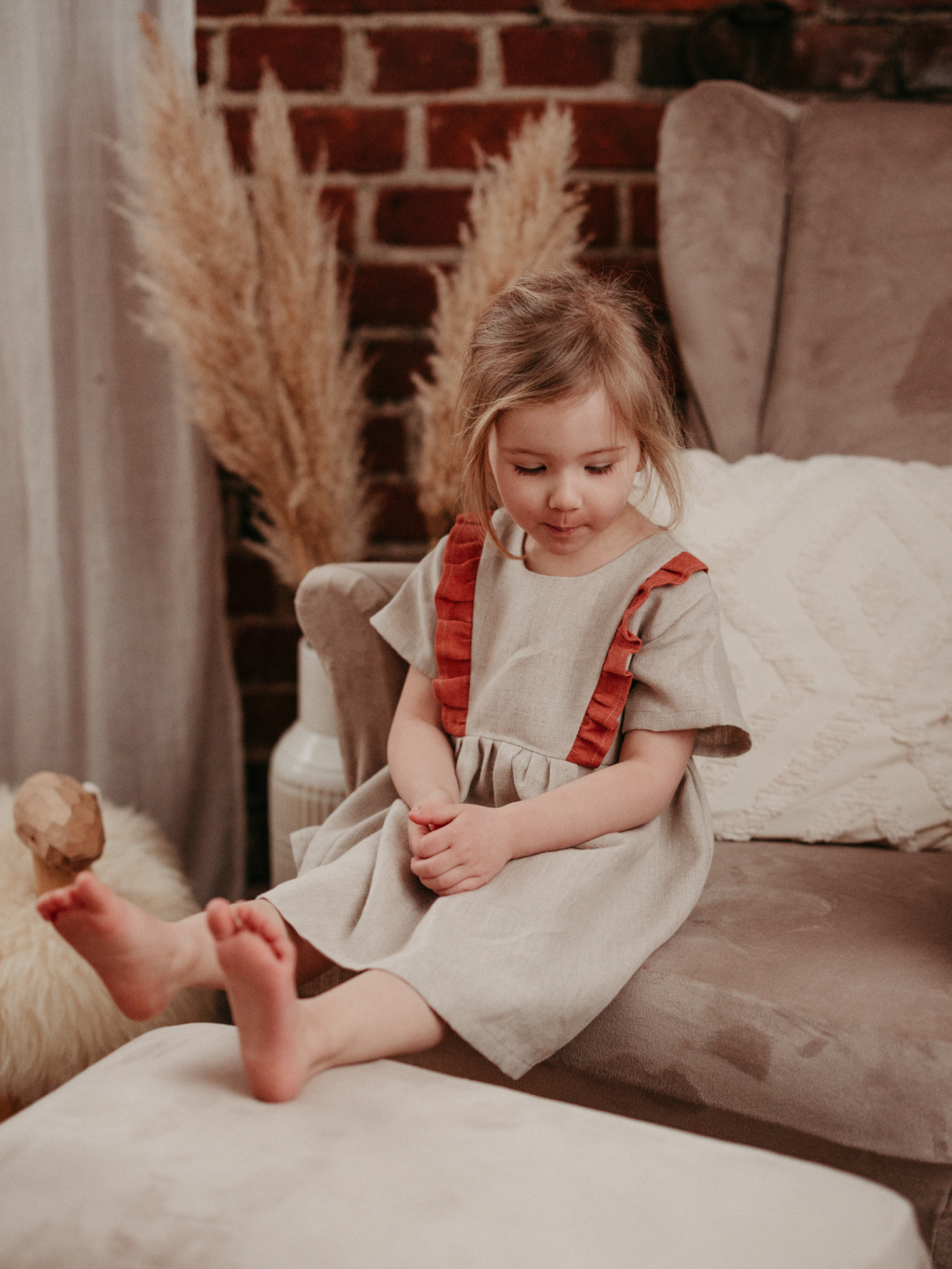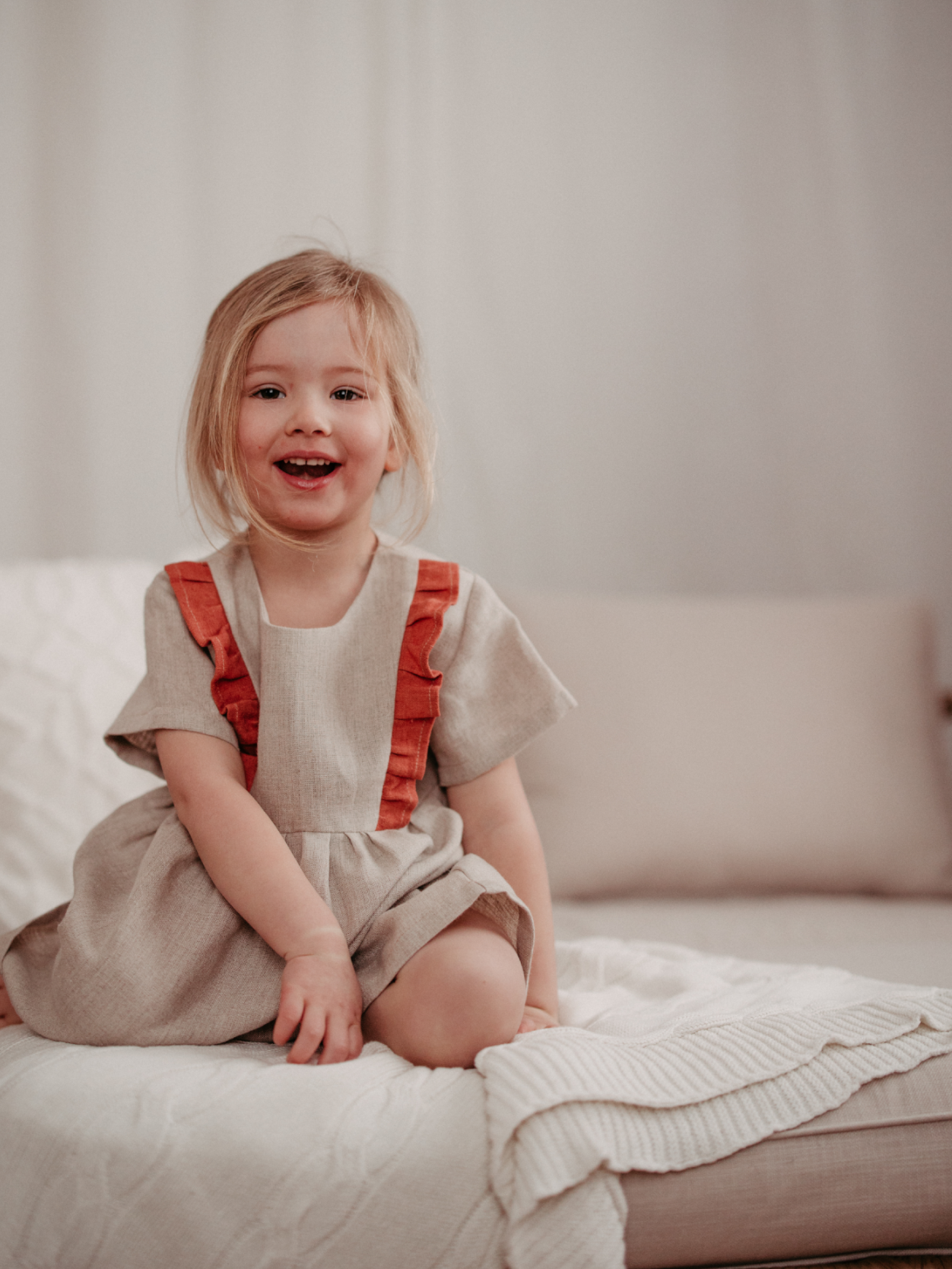 Edessä käsityönä krappijuurella kasvivärjätyt frillat.